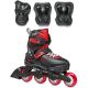 Rollerblade Fury Combo – дитячі ролики з регульованим розміром у комплекті із захистом. Легка лита конструкція забезпечує бічну підтримку для ролерів-початківців, а колеса діаметром 72 мм і жорсткістю 80A в парі з підшипниками SG3 забезпечують хороший баланс швидкості і контролю. Модель для дітей середнього віку та підлітків. Черевик регулюється натисканням кнопки не більше чотирьох розмірів. Регульований еластичний лайнер Performance Junior з розміром, що адаптується, для максимального комфорту протягом усього терміну використання роликових ковзанів. Комплект захисту складається з наколінників, налокітників та захисту зап'ясток. Анатомічна форма специфічна для правої та лівої сторони. Міцні пластикові частини захищають від подряпин, а сітчаста м'яка підкладка дихає і комфортно прилягає до тіла.